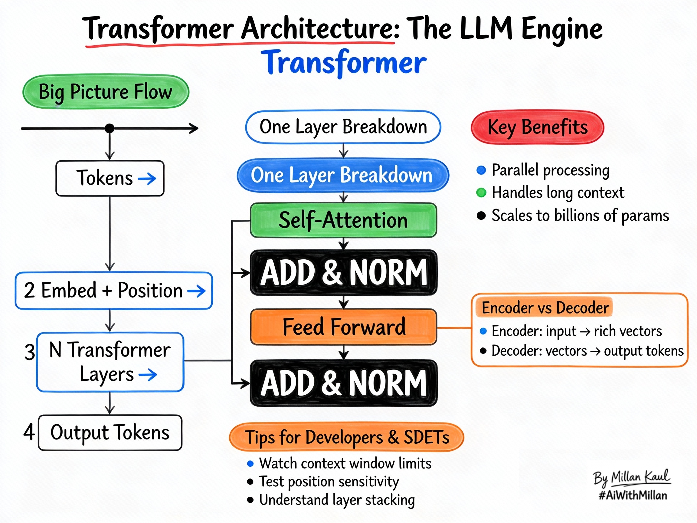 - Next-token training: “The quick brown fox jumps over the lazy” → predict “dog” (learns grammar, facts).